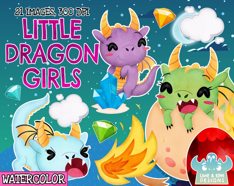 Little Dragon Girls Watercolor Clipart Instant Download Etsy